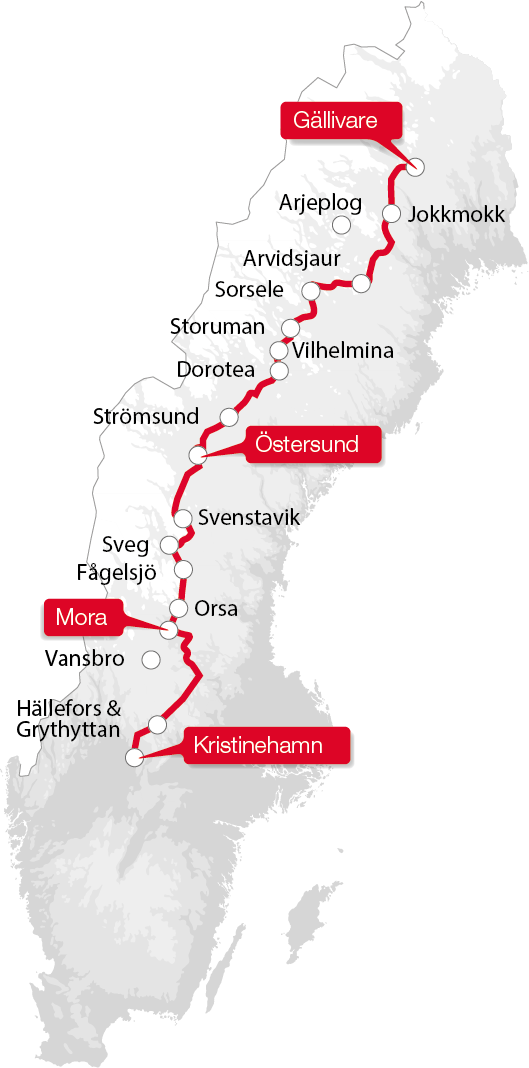 Har du sex dagar till förfogande kan du exempelvis ta första natten i Mora och andra i Östersund. Tredje och fjärde natten tar du i Gällivare för att få en heldag där, innan Inlandsbanan tar dig söderut igen till Östersund där du tar den femte och sista övernattningen. Dag sex kommer du fram till Mora vid lunchtid och där avslutas din resa.