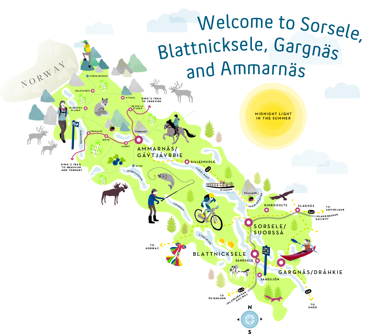 Vad som också ligger oss extra varmt om hjärtat är Inlandsbanan. I Sorsele är det lätt att kliva av tåget för vidare äventyr och upplevelser. När du åker med tåget söderifrån och i riktning norrut, kommer du först till Sandsjön följt av Blattnicksele. På båda platserna kan du kliva av men glöm inte att meddela tågpersonalen. Nästa stopp är på tågstationen i centralorten Sorsele. Det är också härifrån som bussen tar dig vidare till den samiska fjällbyn Ammarnäs.